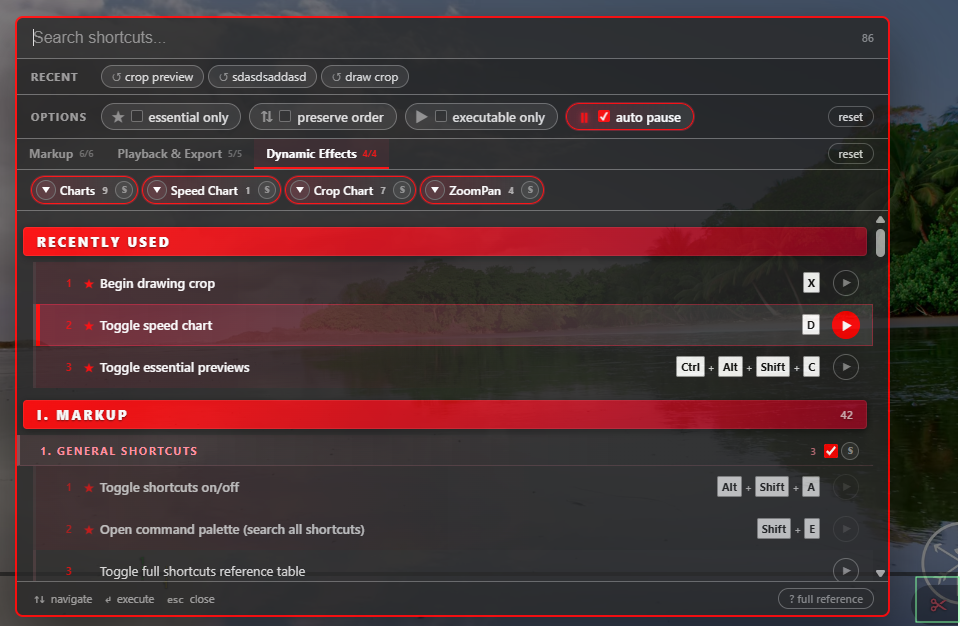Shift+E: Open command palette to search and execute all shortcuts. Can also be opened with the scissors button in the right side of the video player controls.