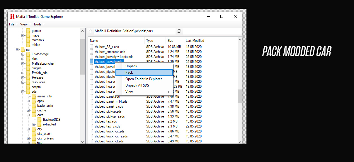 Modded car from Mafia 2 Classic in Mafia 2 Defintive Edition looks like chameleon, well that because Mafia 2 Definitive Edition has another paint textures. You need to copy all dds files from extracted original Mafia 2 Definitive Edition model and copy & replace to your extracted modded car. Copy and replace/paste entries responsible for textures in sdscontent.xml too. To do so, double click on sdscontent.xml to open sds content editor. In that editor click option Tools and then click Auto-Add files. If a warning message appears then accept it. Then select File and click Save. Go back to cars folder and pack sds file back.