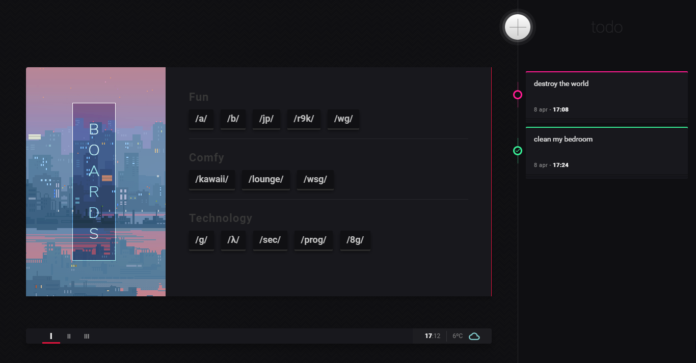 dawn A startpage called "dawn" (WIP) Live Preview Keybindings Numrow/Numpad switch tabs (this is for i3. You can change this in powerline.js) s open search dialog Preview