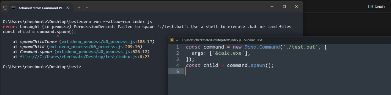 A prior patch aimed to block spawning Windows batch/shell files by returning an error when a spawned path’s extension matched .bat or .cmd. That check performs a case-sensitive comparison against lowercase literals and therefore can be bypassed when the extension uses alternate casing (for example .BAT, .Bat, etc.).