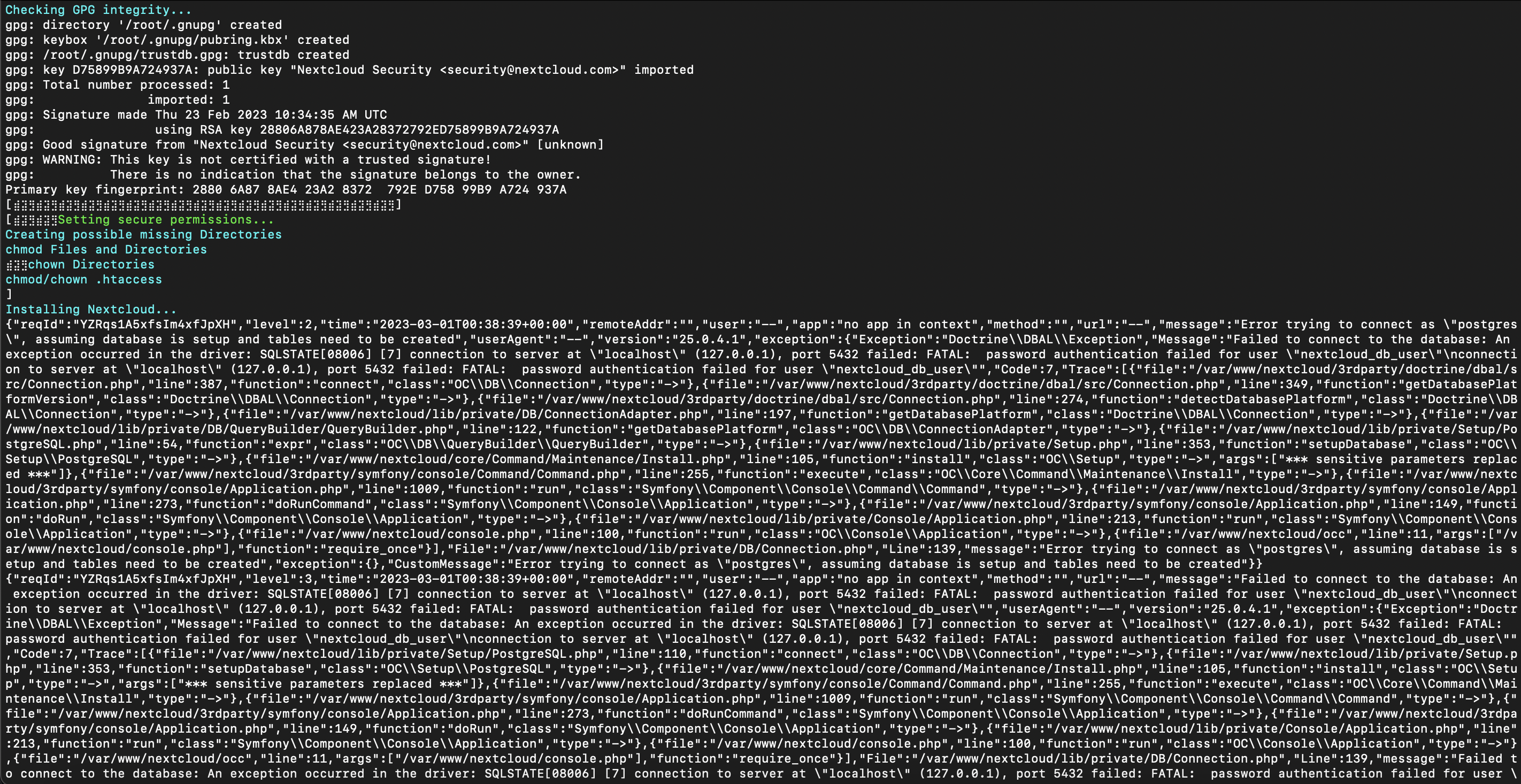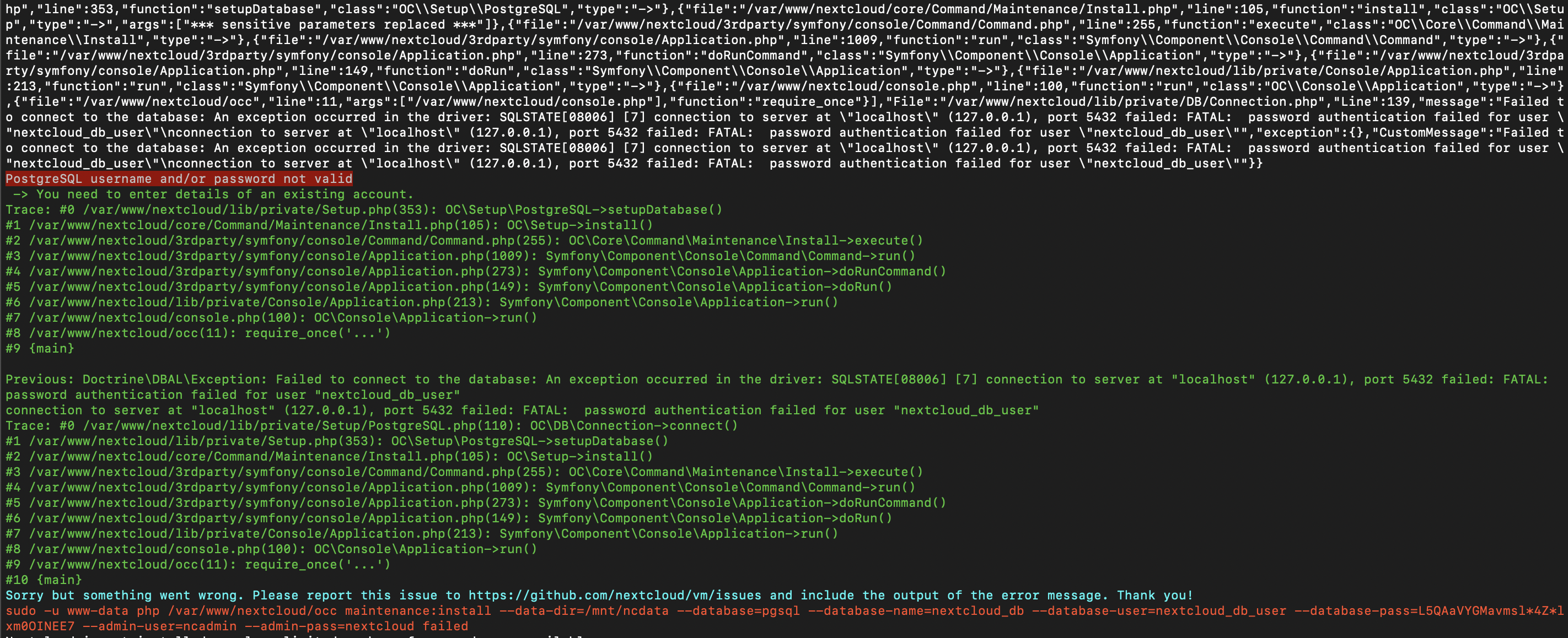 sudo -u www-data php /var/www/nextcloud/occ maintenance:install --data-dir=/mnt/ncdata --database=pgsql --database-name=nextcloud_db --database-user=nextcloud_db_user --database-pass=L5QAaVYGMavmsl4Zlxm0OINEE7 --admin-user=ncadmin --admin-pass=nextcloud failed