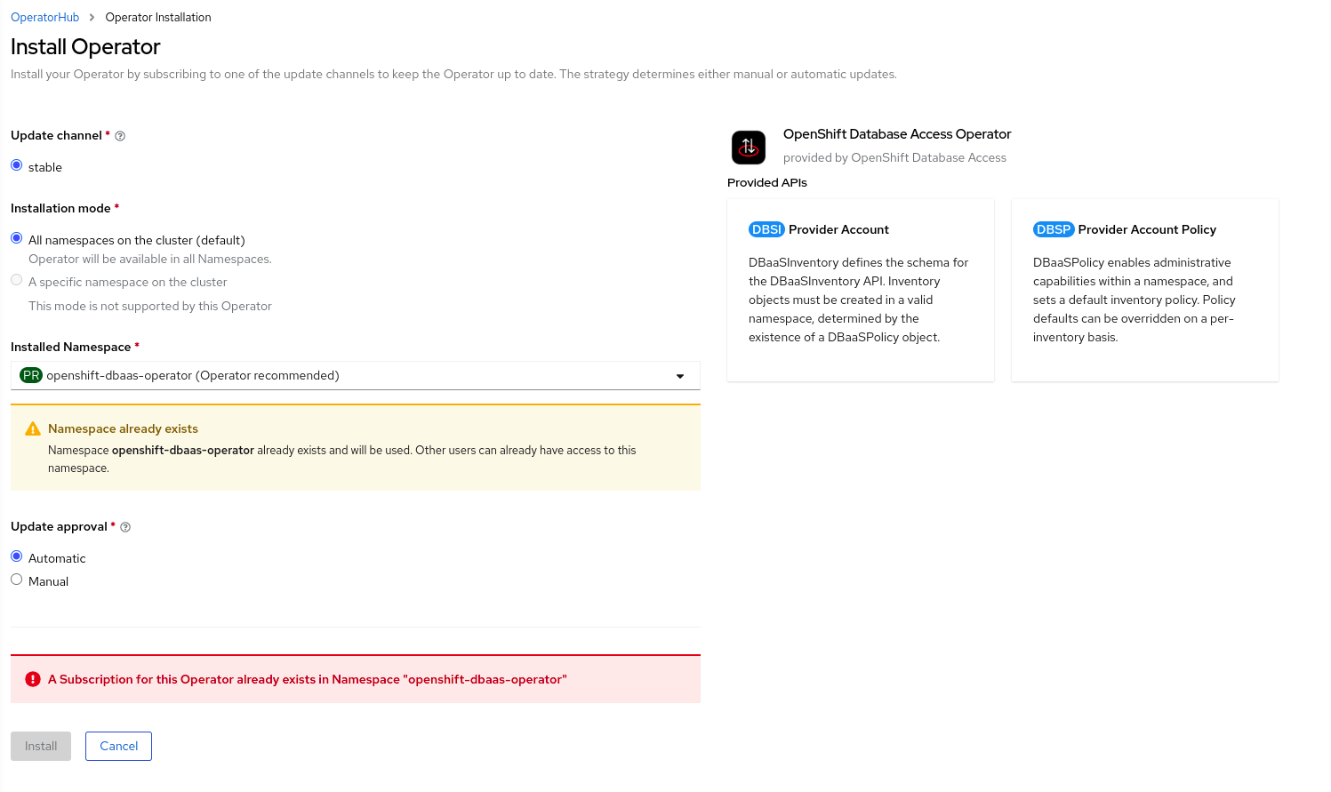 @jhadvig We are facing a similar issue with the DBaaS Operator. When we try to install it from OperatorHub, we receive an error message that says A subscription for the operator already exists, as seen in the screenshot below. However, the operator is still installed successfully. The DBaaS Operator, like ODF, has a UI component that is added as a plugin to the console. This may be the root cause of the issue |