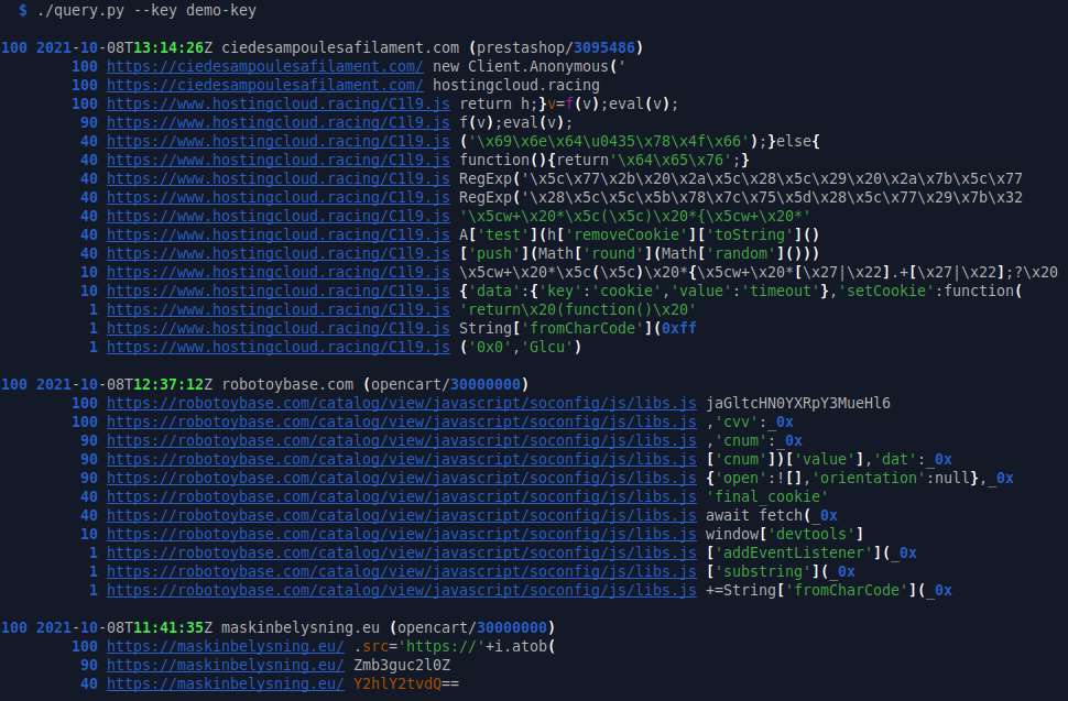 curl -H "X-API-Key: demo-key" https://intel.sansec.io/v3/detection?platform=opencart