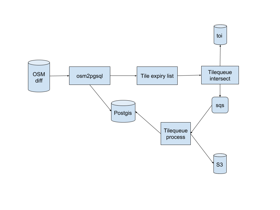 osm2pgql applies OpenStreetMap planet file diffs to the database, and it would generate a tile expiry list. tilequeue (tilequeue intersect command) would read this list, and the tiles that were in the TOI (tiles of interest list) would get enqueued onto Amazon's SQS for processing. A number of instances running tilequeue process would read tiles from SQS, generate them and store them onto Amazon's S3.