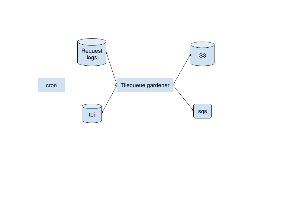 To manage the TOI (tiles of interest list), a "gardener" process (tilequeue prune-tiles-of-interest command and config), would run periodically (say daily) to add and remove tiles from the TOI based on a rolling window of requests (usually 2 months average service usage). New tiles would get enqueued for processing by tilequeue, and tiles to be removed would get deleted from S3.