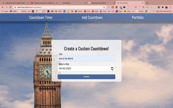 This is a custom countdown app. User can title their countdown and enter in a date. Countdown will then display days,hours, minutes, seconds until data arrives accourding to Universal time zone. Localstorage is used to keep the users data everytime they return to the page.
