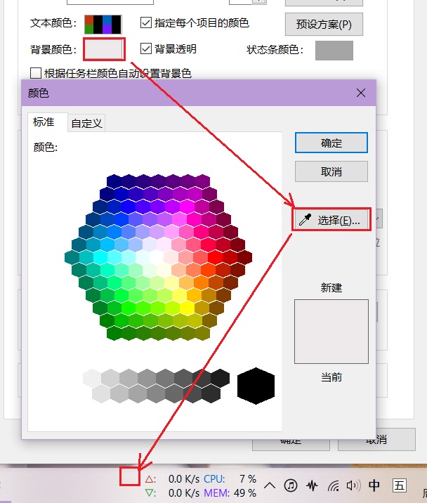 你可以在点击“背景颜色”右侧的矩形框,弹出“颜色”对话框后,点击“选择”按钮,选取一个任务栏上的颜色作为背景色,如下图所示:
