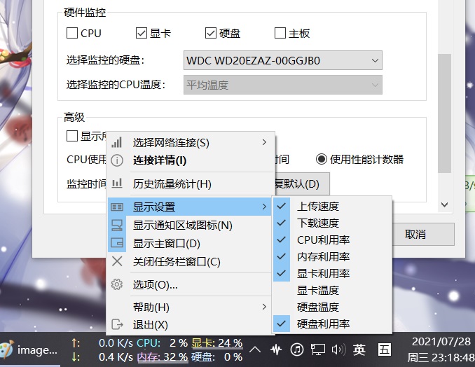 如果没有在“硬件监控”中开启对应的监控项目,或者你使用的是Lite版的TrafficMonitor,则这里的选项将不可用。