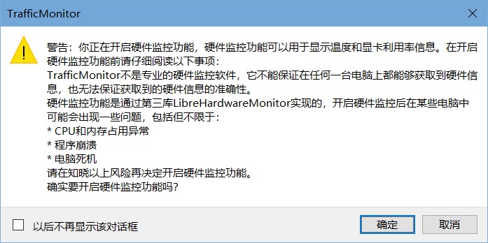 硬件监控功能使用了第三方库LibreHardwareMonitor。据部分用户反馈,开启硬件监控功能会导致一些问题,例如CPU占用异常、电脑死机等。如果没有硬件监控的需要,建议不要开启此功能。当开启任意一项硬件监控功能时,都会弹出一个提示对话框,如下图所示: