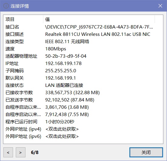 The last three items -- "program elapsed Time", "Internet IP Address (ipv4)", and "Internet IP Address (ipv6)" -- are independent of the network connection selected.